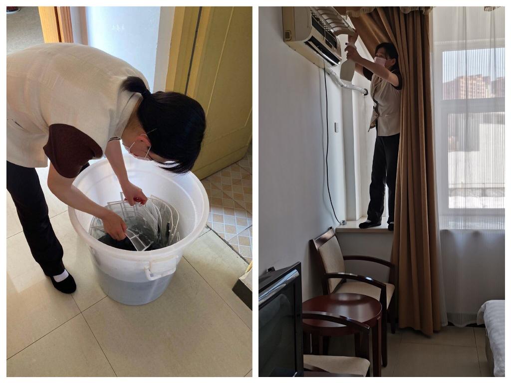 为了给即将到来的实习师生提供一个良好和安全的住宿环境,秭归科教基地对所有客房、学生公寓的空调进行清洗消毒,对床上用品进行晾晒,并将公共区域的沙发、地毯也进行了清洗消毒。大家都各有分工,棉絮被褥搬运晾晒,空调过滤网拆装并进行消毒,员工相互协调、互相配合,顶着烈日,不怕脏,不怕累,用实际行动为