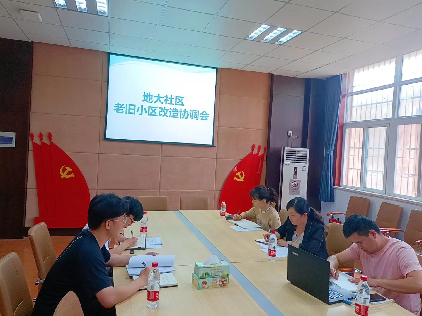 2022年6月7日,地大社区召开“老旧小区改造”协调会,与房产管理科、第三方入户调查人员就《老旧小区改造居民意愿调查》工作进行商讨协调,确保入户数据真实准确,力争民意调查工作有序推进、顺利完成。武汉市老旧小区改造工作实施以来,为改善居民的生活环境,提高居民的生活质量,地大社区历年数次申请、多方不