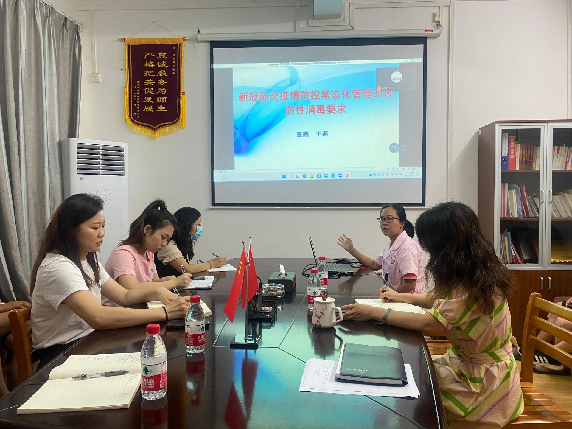 6月27日下午,劳动服务中心邀请校医院公共卫生科王燕担任主讲老师,为中心职工和商户开展“爱国卫生运动”专项培训。此次培训采取线上+线下相结合的方式展开。劳动服务中心主任黄晶晶、党支部书记杨扬、中心各部门职工及商户代表共同参加培训。 王燕老师针对当前疫情防控形势下如何开展“灭四害”等工作,以《病