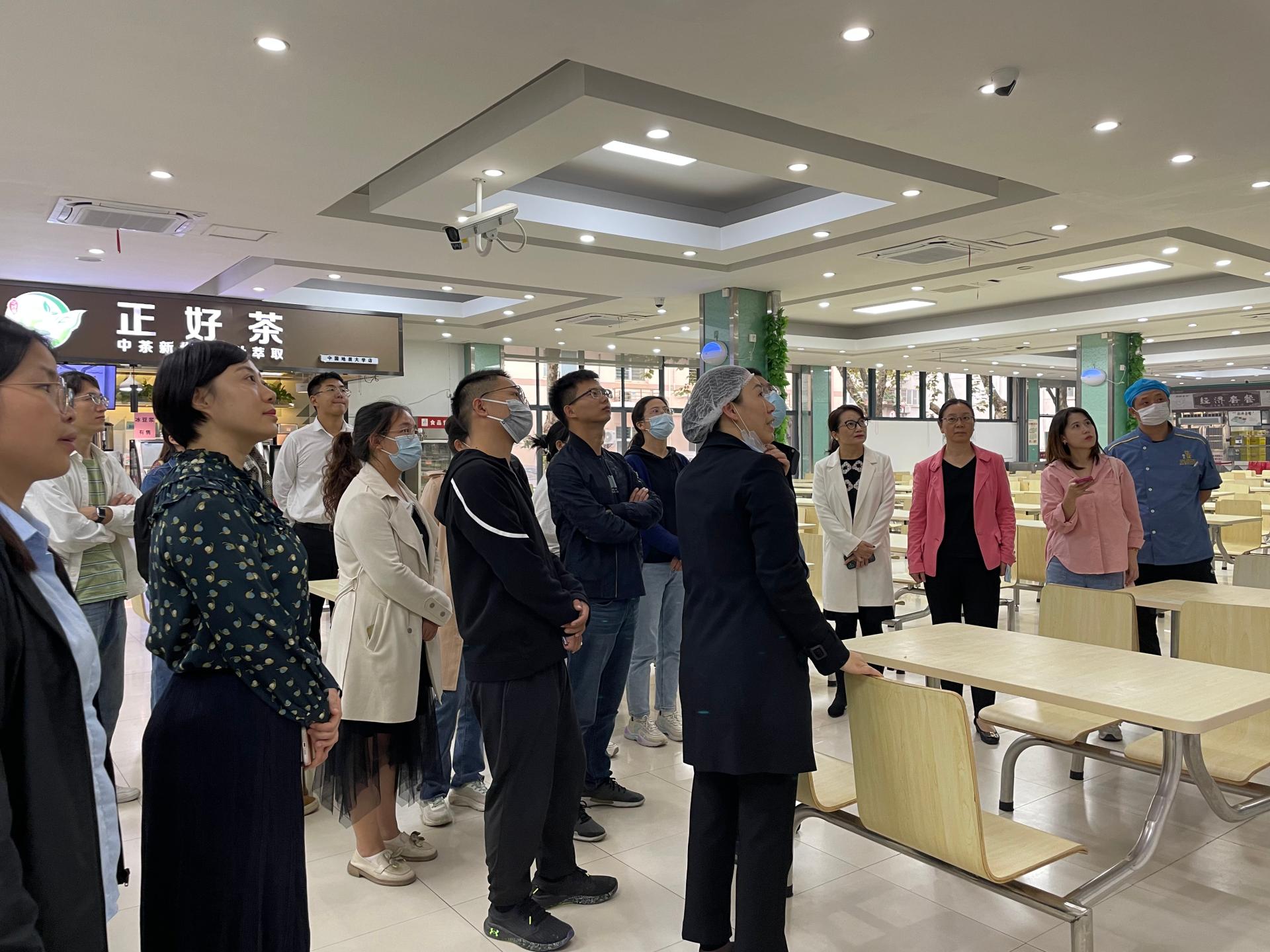 袅袅秋风起,翩翩秋夜舞;金秋十月,与您相约。10月12日,校工会组织开展2023年新入职教职工“认家”活动,校工会常务副主席郭秀蓉带领近30名新入职教职工相聚东苑餐厅,共同走进食堂,揭开后厨的神秘面纱。后勤党委书记黄菊、后勤分工会主席左涵之对郭秀蓉一行的到来表示诚挚欢迎,并陪同大家一起参观了餐厅后厨