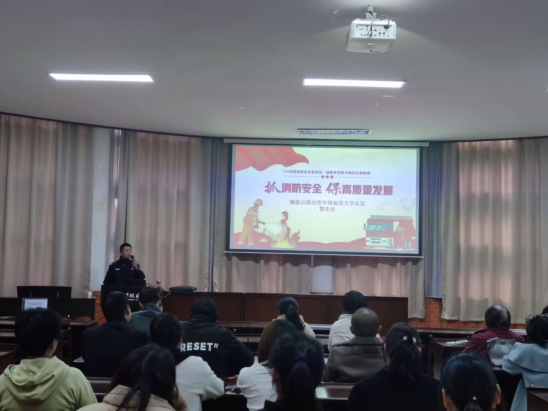 安全无小事,预防是关键。为进一步加强商户消防安全意识,提高应对突发事件的应急能力,11月22日下午,劳动服务中心在东苑会议室开展消防安全知识专项培训,培训特邀请喻家山派出所姜瀚警官主讲,商户代表共计81人参加培训。在消防安全讲座上,姜瀚警官首先让大家观看了火灾预警视频,然后结合一个个真实惨痛、发