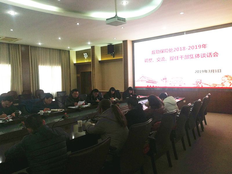 为强化干部队伍建设,激发干部干事活力,以更加昂扬的精神状态和更加务实的工作作风,团结带领广大员工做好后勤保障服务工作。后勤保障处于2019年3月1日在惠宾楼2号会议室召开干部集体谈话会。处长王文起,后勤党委书记蔡楚元,后勤党委组织委员、副处长郭敬印,后勤纪委书记王伟,2018-2019年度后勤保障处调整、