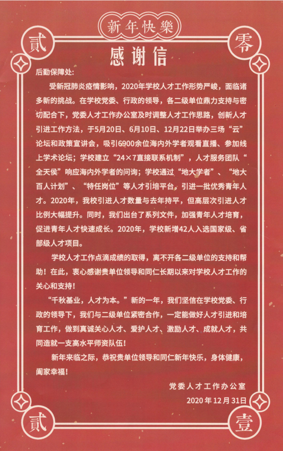 近日,后勤保障处收到来自学校党委人才工作办公室的感谢信,信中对后勤保障处积极配合并支持学校人才工作,为学校本年度人才招聘工作提供支持和服务表示感谢和赞扬。在当前疫情防控的特殊时期,后勤保障处提高政治站位,压实工作责任,积极配合学校各兄弟单位,以热情周到服务,确保疫情防控措施到位,人才引进工