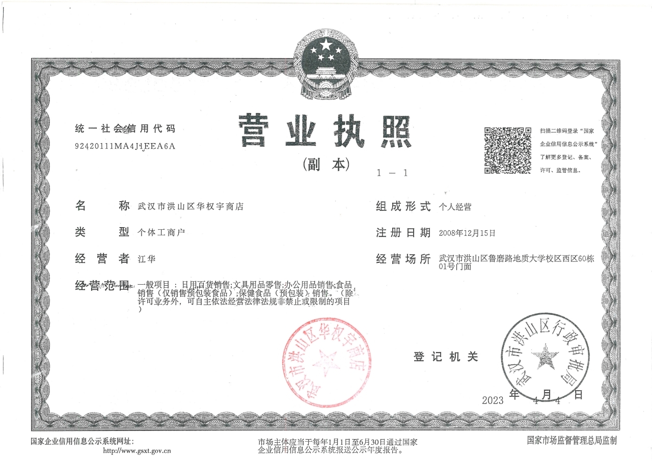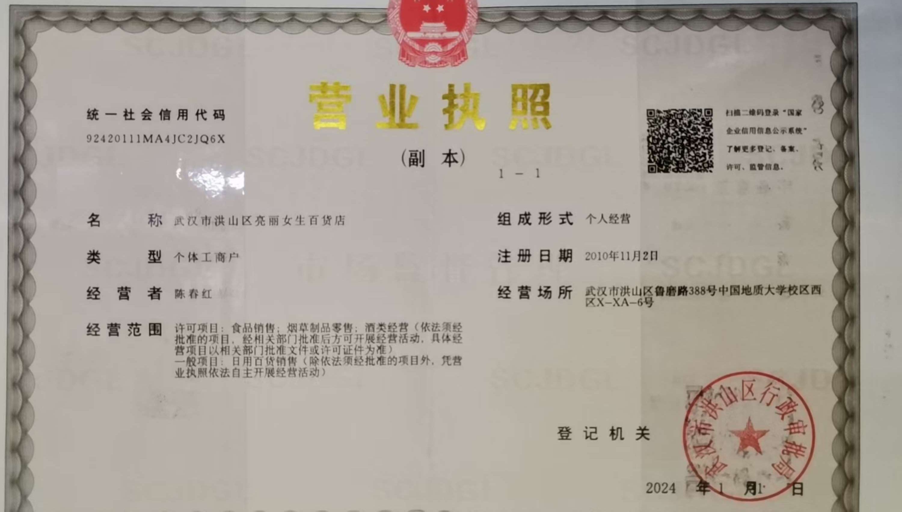 6 | 亮亮商店 | 南望山校区西区饮食中心职工宿舍106 | 武汉市洪山区亮丽女生百货店 | 2025.11.21 | |