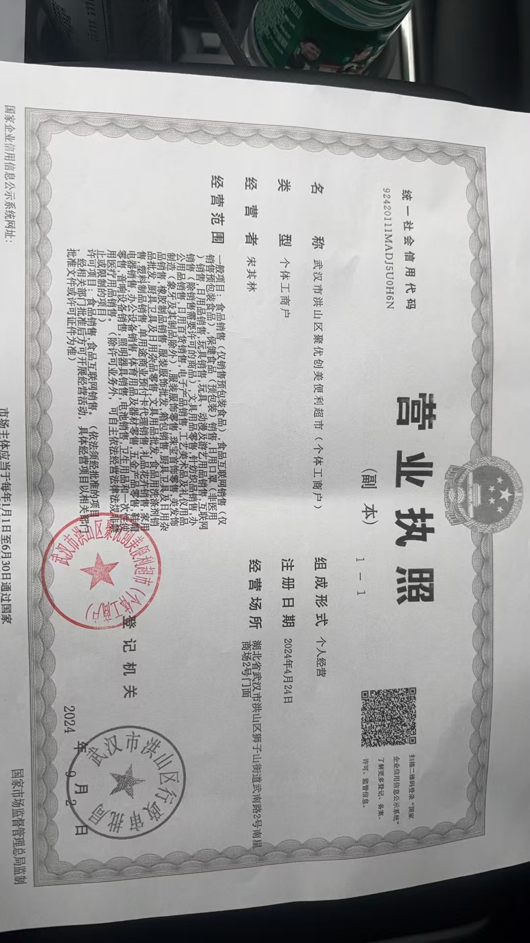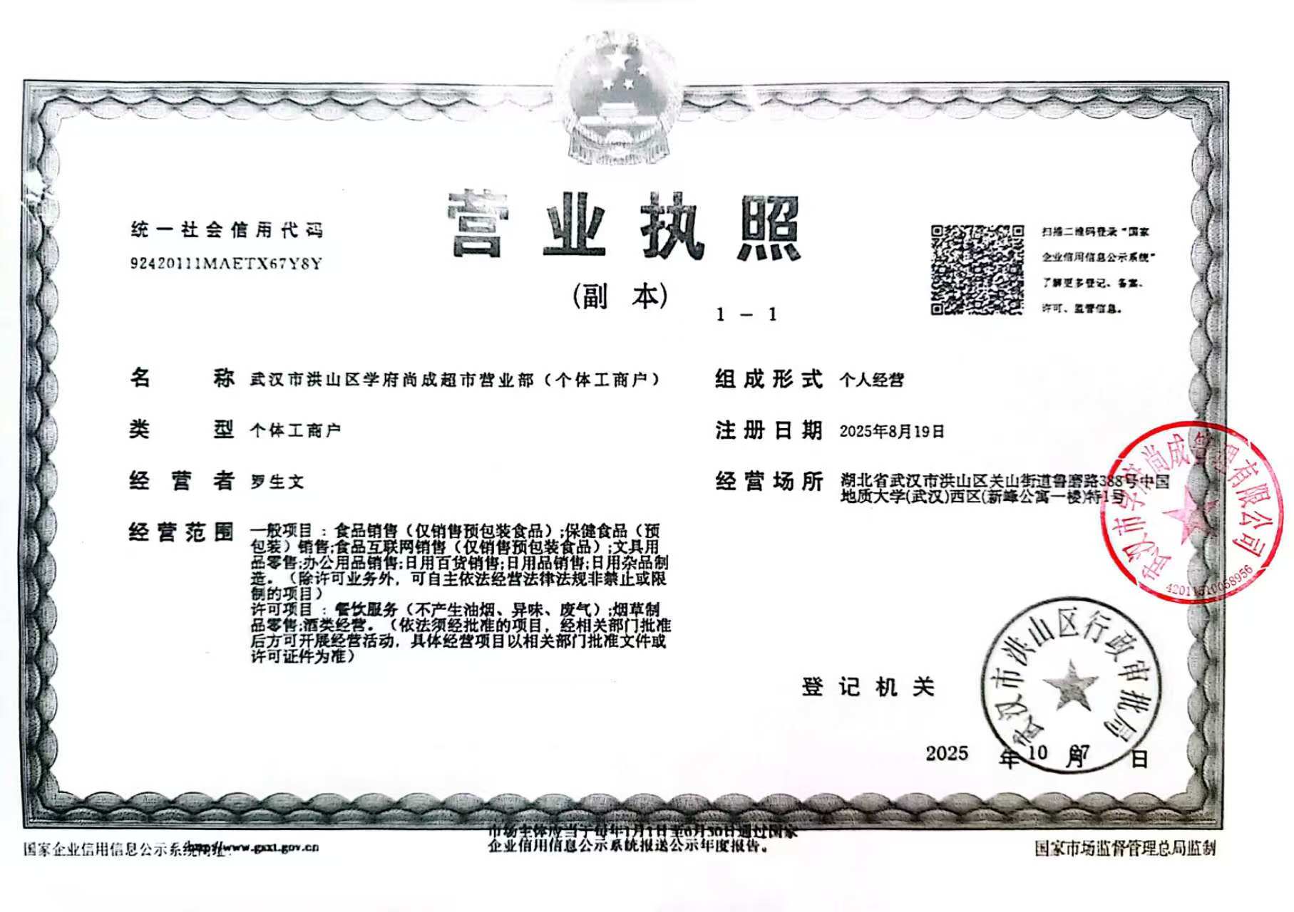 2 | 学府尚成超市 | 中国地质大学(武汉)西区(新峰公寓一楼)特1号 | 武汉市洪山区学府尚成超市营业部(个体工商户) | 2025.11.21 | |
