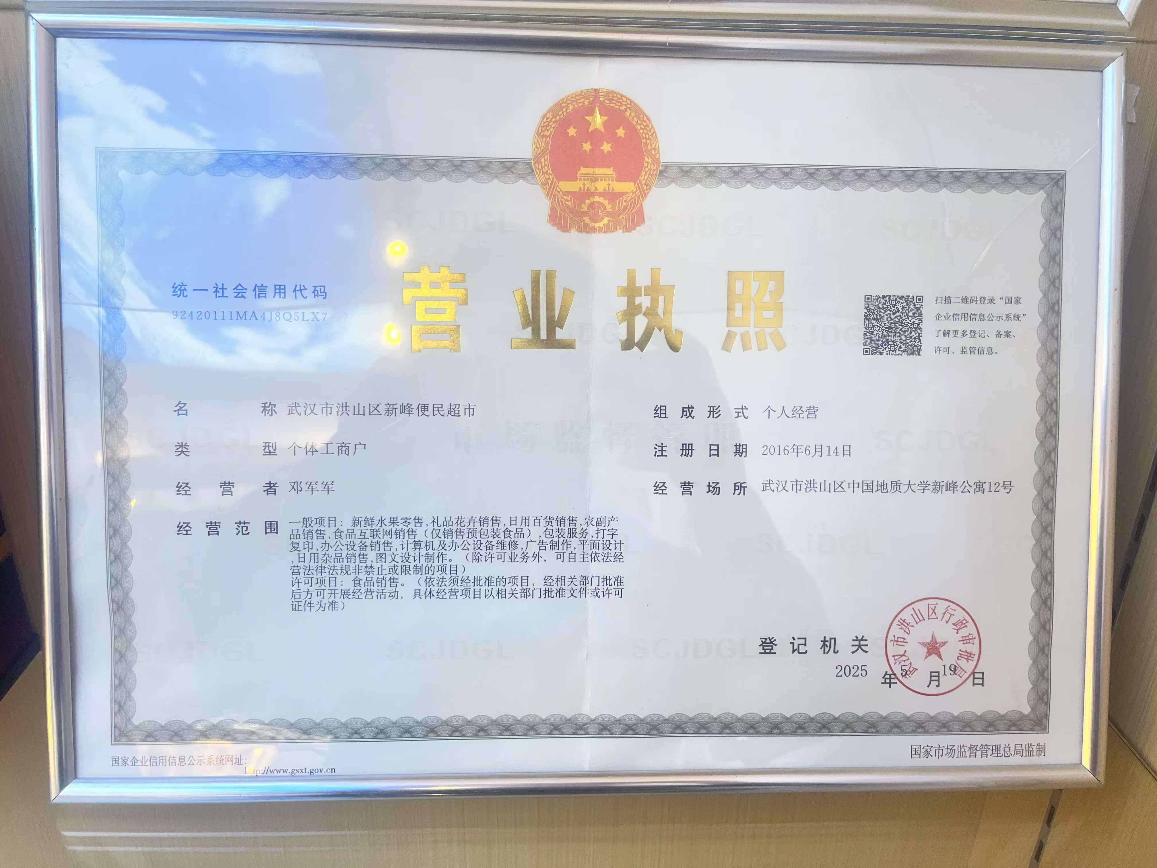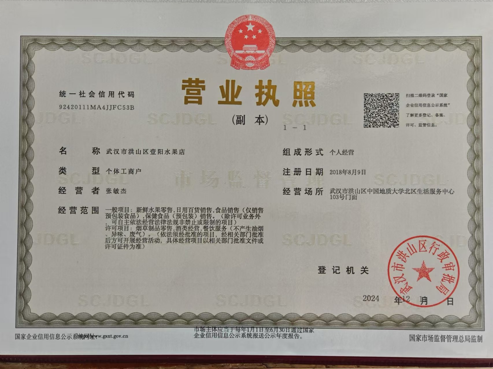 13 | 鲜果园 | 南望山校区西区新峰公寓A栋112 | 武汉市洪山区新峰便民超市 | 2025.11.21 | |
